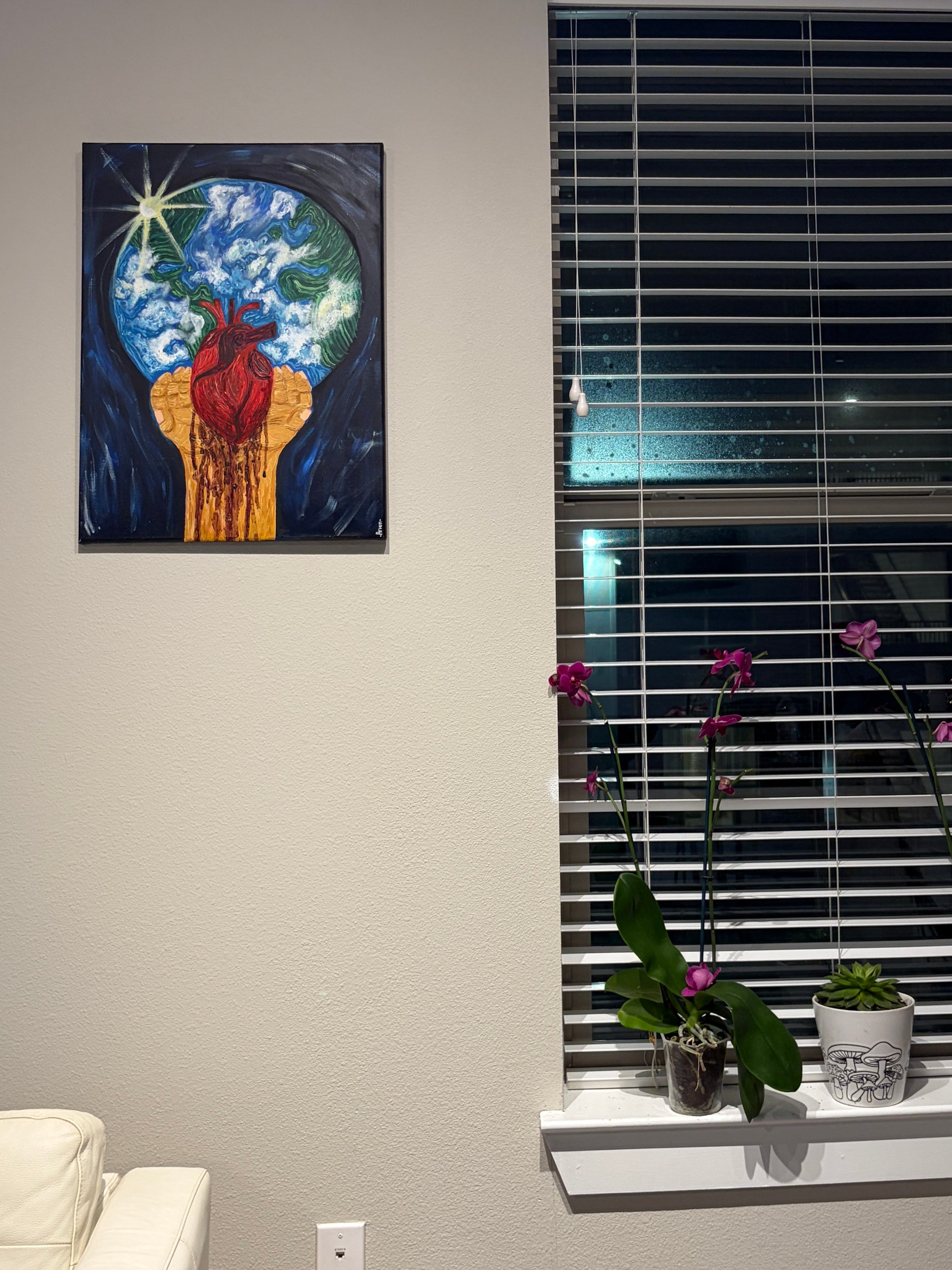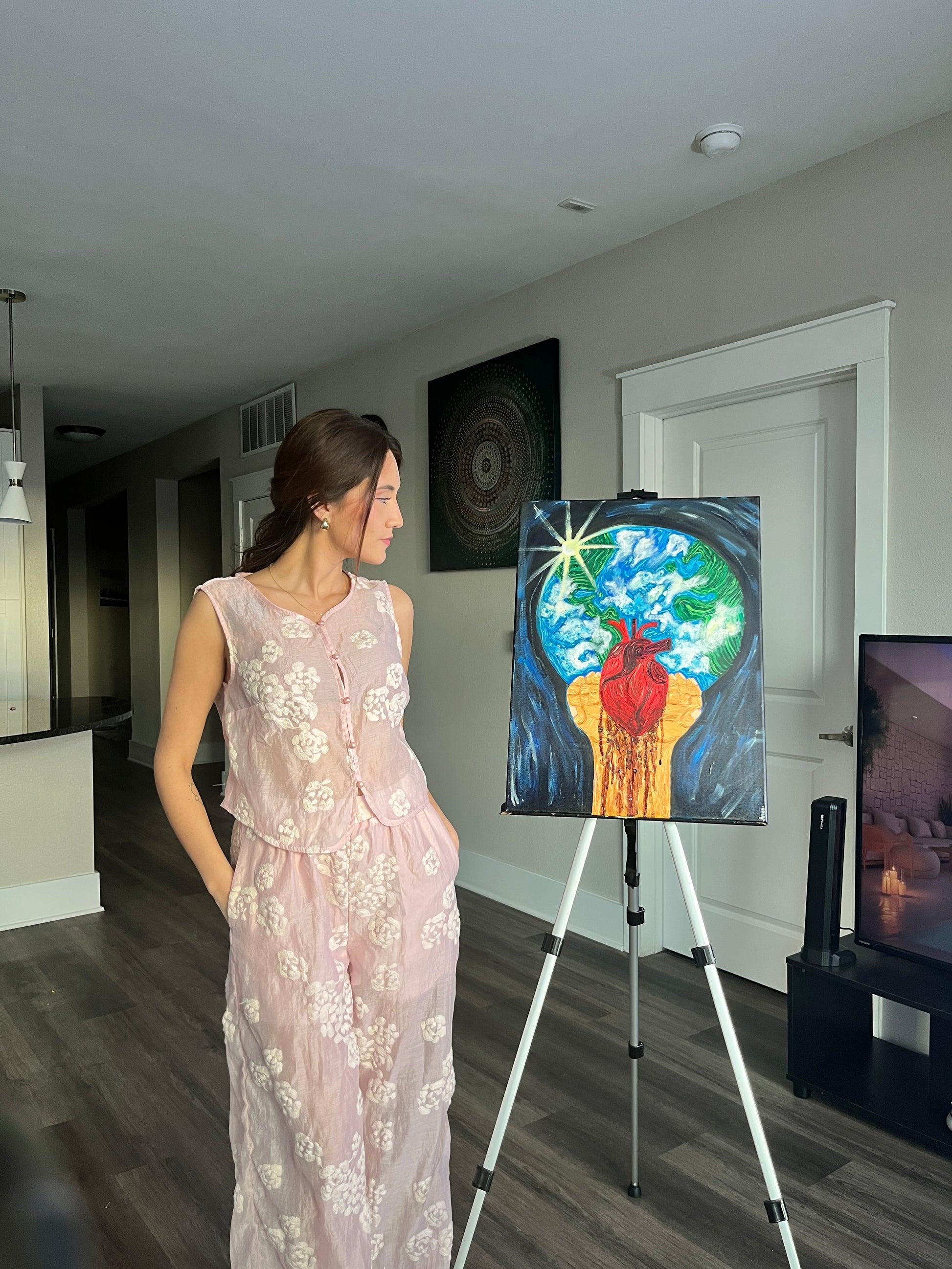 This painting is inspired by the journey of life and the simple yet profound truth that my purpose on Earth is to give my heart.a world of possibility and connection Offering My Heart